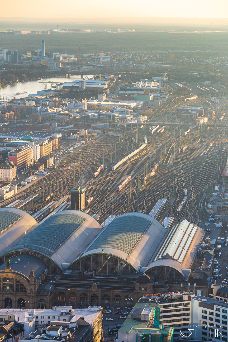 하웁트바허 광장과 마인강, 그리고 엄청난 기차선로가 보이는 프랑크푸르트 중앙역이 자세히 보입니다.