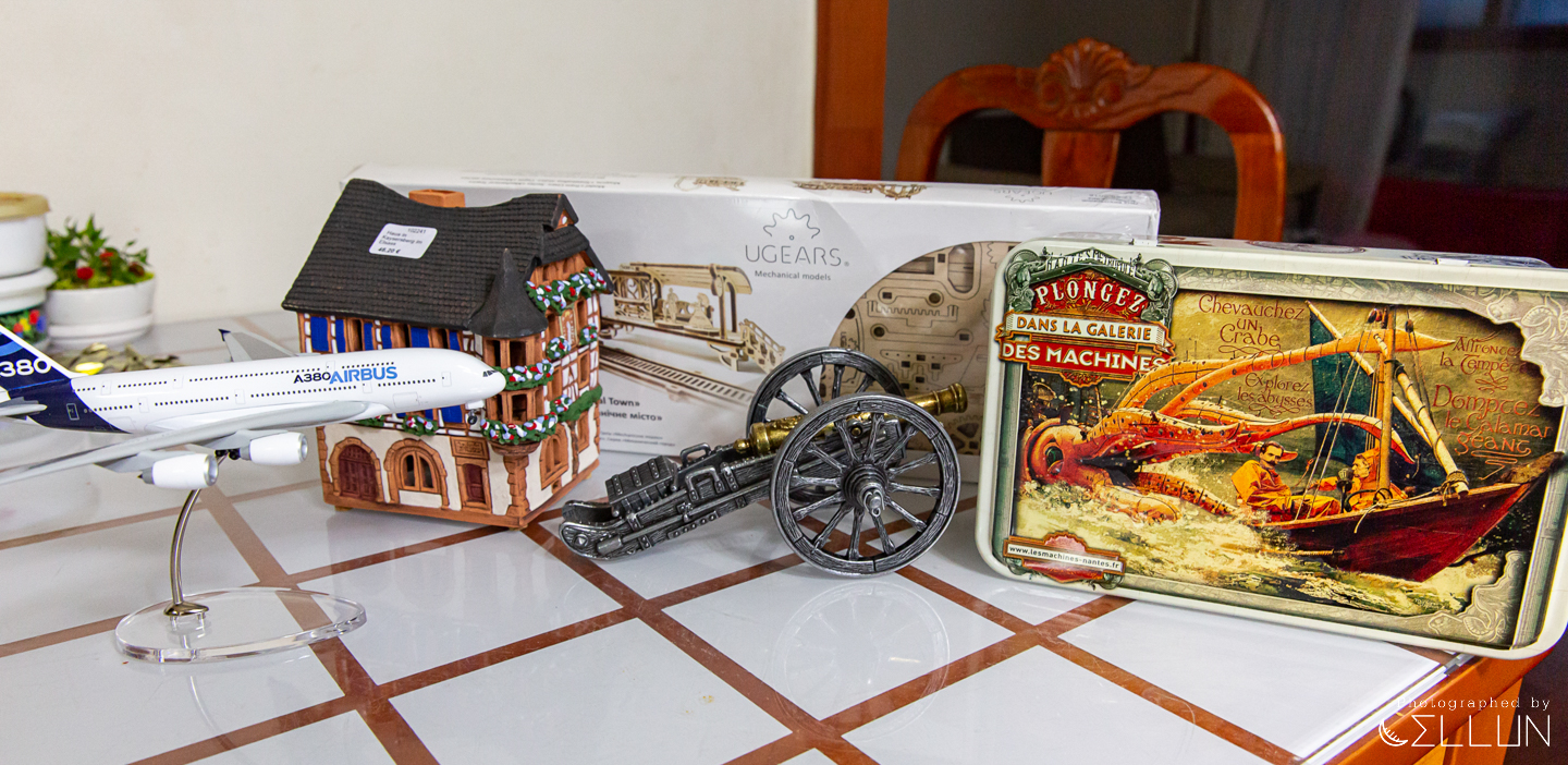 맨 왼쪽은 툴루즈의 에어버스 항공 박물관에서 산 A380 비행기 모형이고, 그 옆의 집은 프랑크푸르트에서 산 전통가옥 도기 모형입니다. 가격은 비싼 편이지만 '메이드 인 EU'라 퀄리티는 좋습니다. 가운데 주석 재질의 대포 모형은 파리의 앵발리드 군사 박물관에서 산 것인데, 더 멋있는 모형들도 많아서 지금 생각해보면 돈 좀 더 들여서 좀 더 근사한 것을 살 걸 했나 하는 생각도 드네요. 뒤의 것은 기념품은 아니고 'UGEARS'라는 나무재질로 된 조립모형인데 트램역사를 꾸밀 수 있습니다. 질은 괜찮은데 쓸데없이 부피를 많이 차지해서 그냥 좀 더 작은 걸로 살 걸 했나 하는 생각이네요. 그리고 맨 오른쪽 크라켄 같은 것이 있는 양철 케이스는 낭트 '섬의 기계들'에서 산 비스킷입니다. 안에는 과자가 들었는데 사실은 과자보다 케이스가 더 예뻐서 샀었네요. 비스킷도 맛있고 케이스 디자인이 워낙 유니크해서 장식용으로 진열해 놓아도 손색이 없습니다. 먹을 것도 있고 장식도 되고 개인적으로 제일 가심비 좋은 기념품인 것 같습니다.