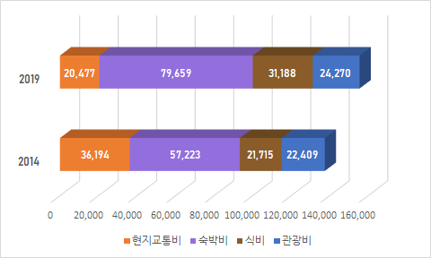 반면 2019년에는 항공,교통비 비중은 합쳐도 27% 수준으로 많이 축소된 대신, 숙박비가 41.5%로 혼자서 거진 여행경비의 절반 가까이 차지하는 현상이 나타났습니다. 식비와 관광비 비중은 30%로 소폭 상승했습니다.