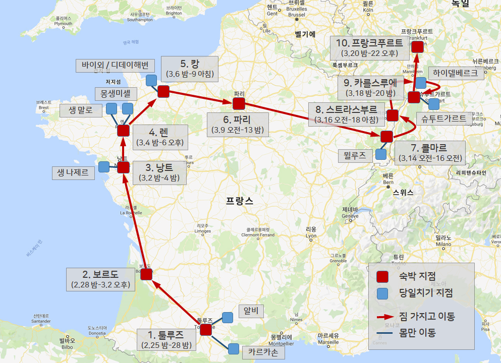 일정은 첫 여행보다 일정이 5일이나 늘어난 것에 비해, 방문지역은 20일을 프랑스, 5일을 독일로 계획하여 일반적인 유럽여행보다는 훨씬 좁은 지역에 집중해서 그래도 좀 여유있는 일정이 되지 않을까 생각했는데... 막상 실제로는 시간이 부족하다는 느낌이 들었습니다. (생각보다 프랑스 땅 크기를 얕봤나봅니다. 독일, 스위스, 오스트리아, 체코를 다 더해야 프랑스 땅 크기...) 총 10개의 도시에서 숙박했고 9개의 도시는 당일치기로 갔다왔으니 도시 수로만 보면 꽤 빡빡한 일정이였던 것 같네요. 어쨌뜬 덕분에 많은 구경할 수 있어서 좋았습니다. 한 나라 안에서도 비슷비슷한 느낌없이 다양한 풍경과 볼거리가 있었습니다.