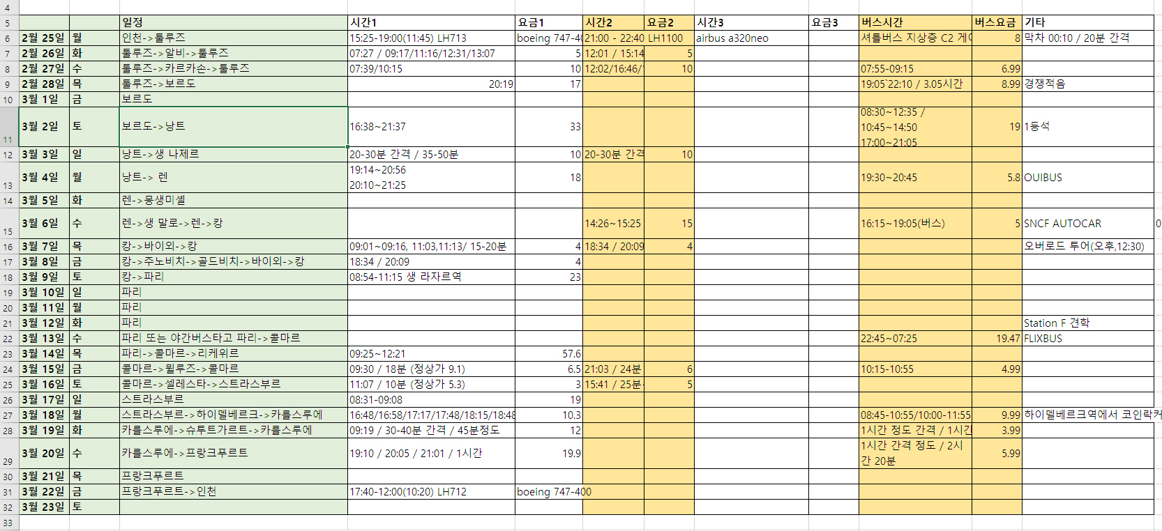 이렇게 작성해놓으면, 나중에라도 어느 교통수단을 이용하면 좋을지, 인터넷에 다시 일일이 들어가 확인하지 않아도 바로 이 표 하나로 확인이 가능하고, 그날그날 일정에 따라 몇 시에 맞춰 도착하면 될 지 가늠하기 편리합니다.