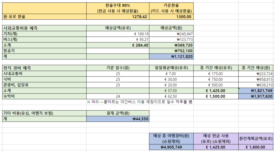 ※ 마지막으로 비용 예상 할 때 현지 통화(유로화)로 계산되는 부분은 환율을 곱해야 하는데, 현금 사용 시에는 환전해갈 현금의 환율, 카드 사용시에는 대략 현재 시점의 환율로 계산하면 됩니다. 만약 현금을 많이 가져갈 생각이라면 현금 기준으로 환율을 계산하면 더 정확해지고, 카드 위주로 사용할 계획이면 환율우대 적용안한 상태에서 환율을 적용하면 되겠지요. (카드 수수료 등의 요소도 고려할 수 있으면 고려하시면 좋구요.)