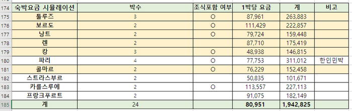 마지막으로 각 도시별 이미 예약한 숙소 또는 잠정적으로 1순위로 정해놓은 숙소의 요금 등 정보를 별도로 아래와 같이 요약해놓으면 현재까지 숙박비로 얼마나 지출되는지 한눈에 확인할 수 있어서 총 예산이 과다할 경우 예약하지 않은 도시는 좀 더 싼 곳으로 예약을 고려하는 등 조정을 쉽게 할 수 있습니다.