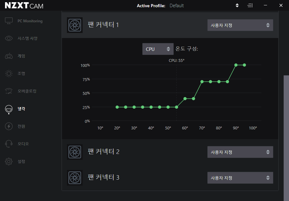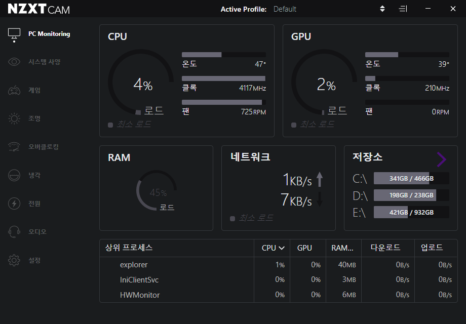 NZXT CAM 소프트웨어를 설치하면 기본적인 PC 모니터링 및 팬과 RGB 컨트롤이 가능합니다.