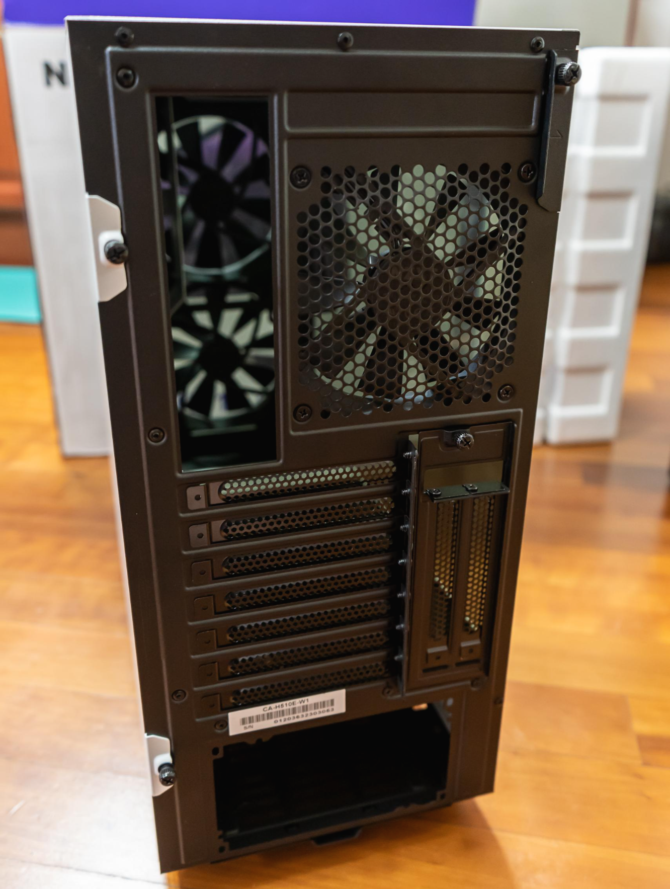 케이스 뒷면은 그래픽 카드 등 부품을 고정할 수 있는 PCI 단자가 7개가 있고, 세로 방향으로도 단자가 2개가 있습니다.