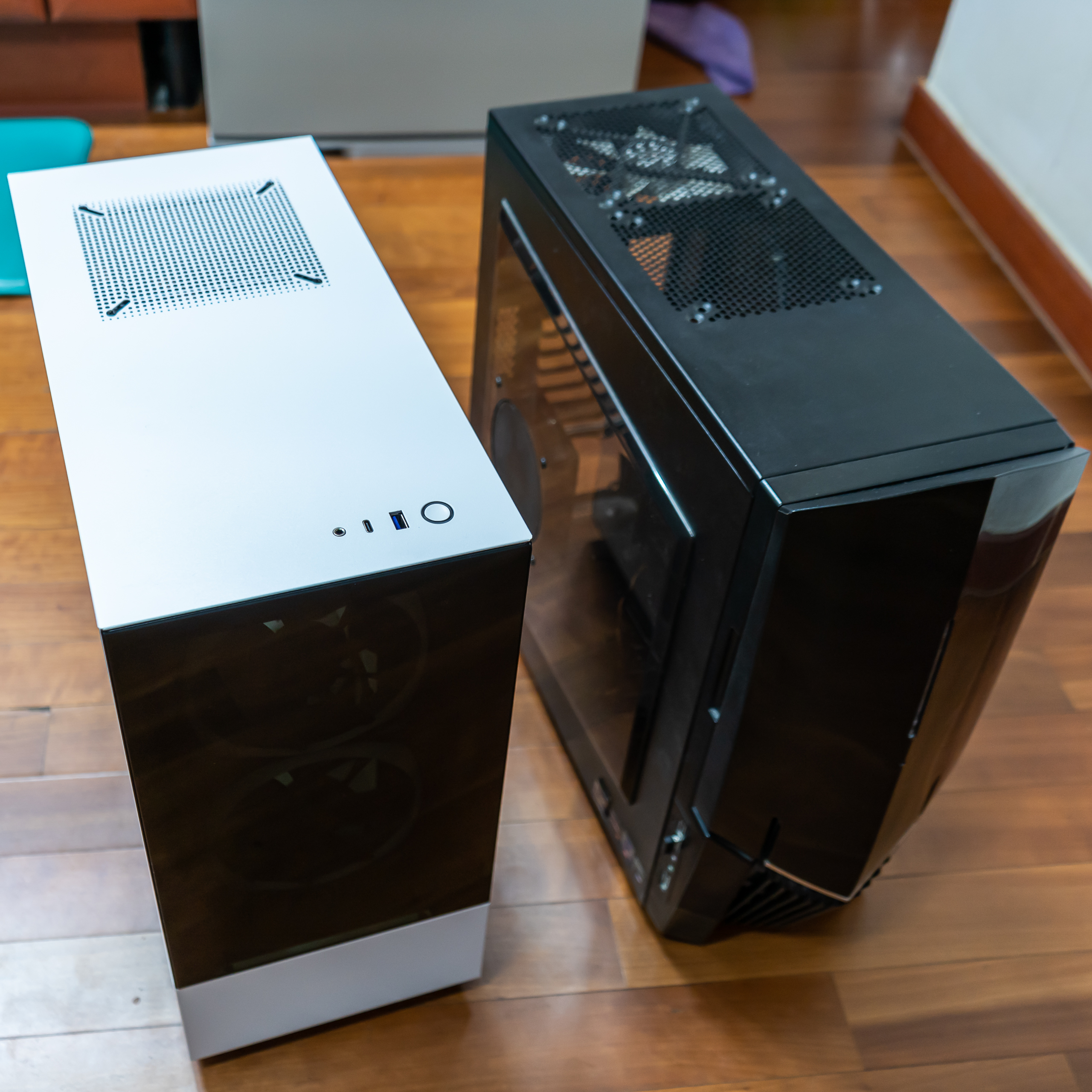 생각보다 작지 않다는 걸 체감하는 게, 지금까지 썼던 오른쪽의 NZXT Lexa-S 케이스와 비교했는데 거의 엇비슷해 보입니다. 스펙상으로는 H510 Elite가 Lexa-S보다 높이는 3cm정도 더 높고 앞뒤 깊이는 10cm 정도 더 작은데, 나란히 놓고 보면 거의 비슷하게 느껴집니다.