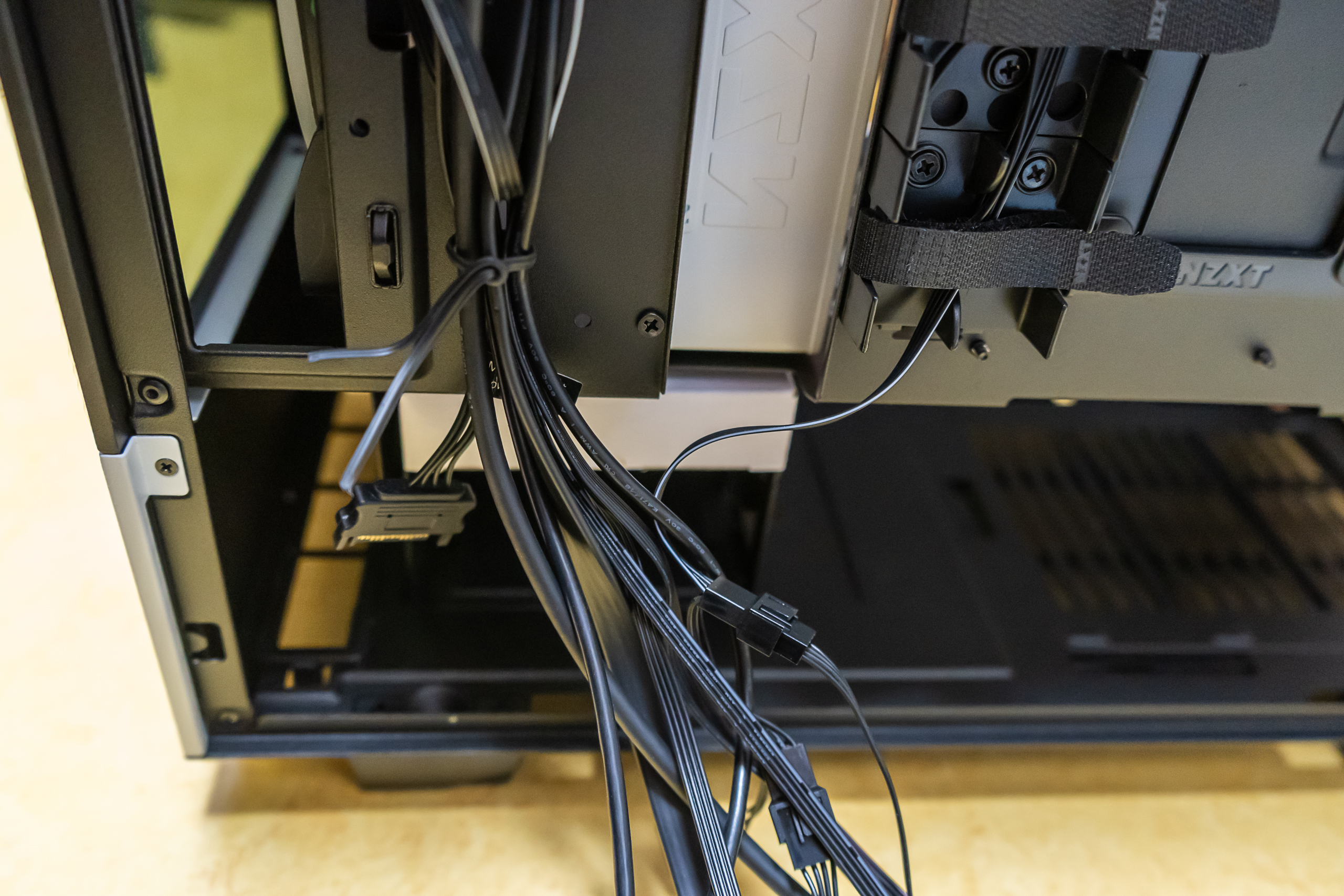 뒷면에는 케이스와 연결된 각종 케이블들이 있고, 선 정리 홀 및 가이드를 확인할 수 있습니다.
