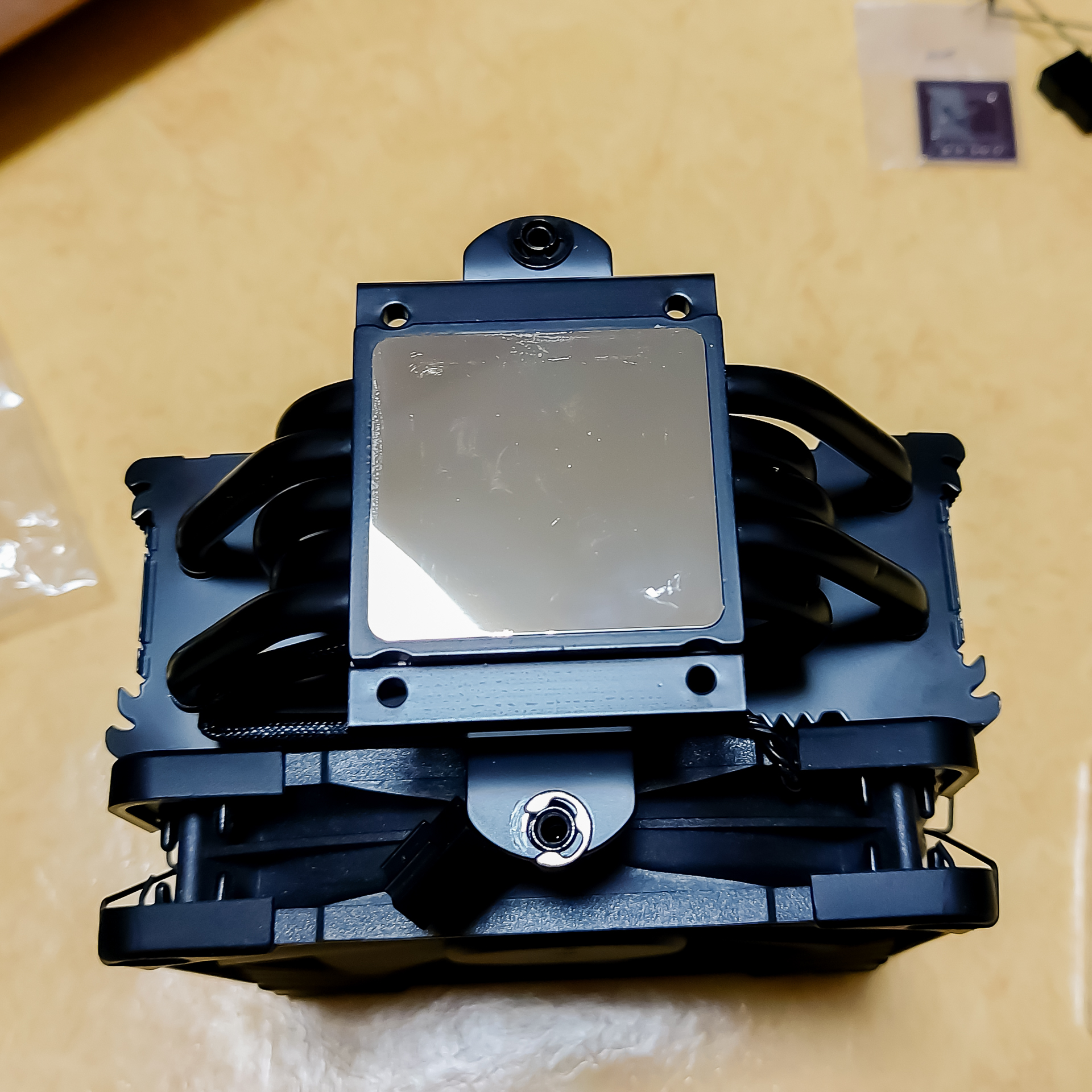 여기 위에 써멀그리스를 도포하고, 메인보드로 가져가 CPU 위에 살포시 올려놓은 다음, 방열판 하단에 달린 손나사를 돌려 고정해주면 됩니다.
