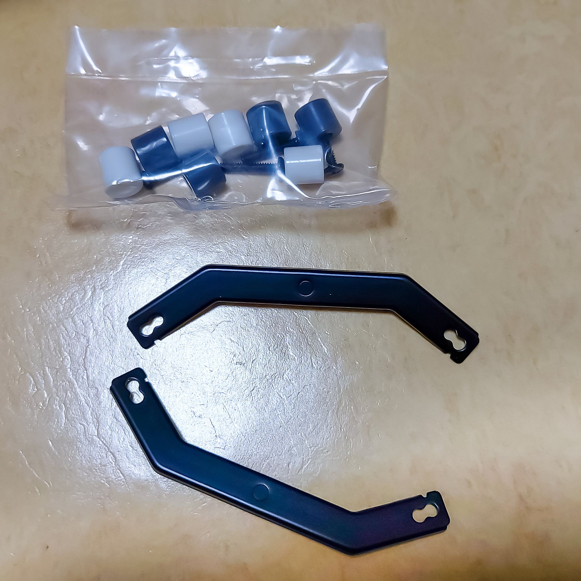 위 사진 처럼 원기둥 부속을 각 나사구멍 위에 올려놓고 그 위에 고정용 부품을 올려놓은 다음 나사로 조이면 됩니다.