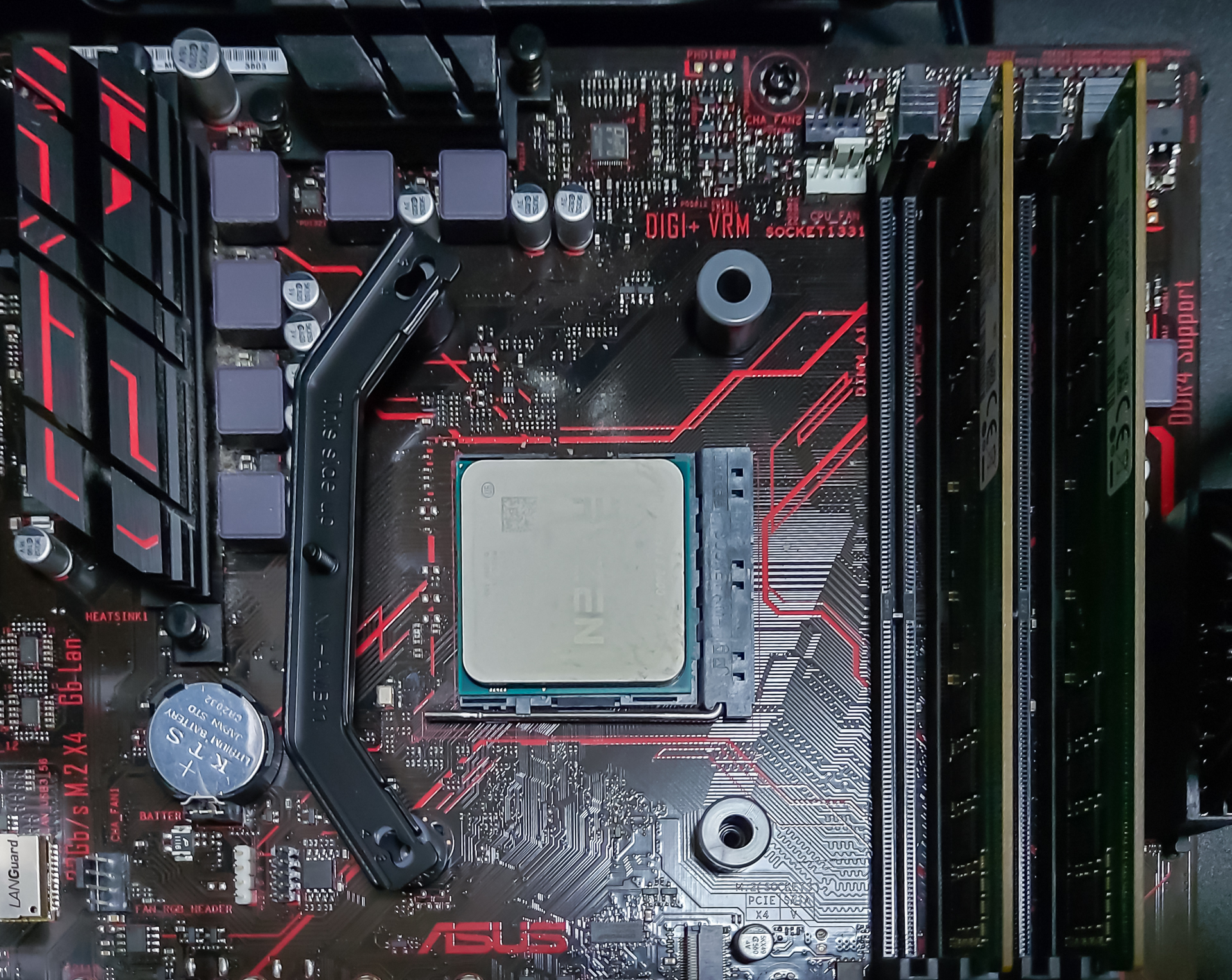 여기서 녹투아 쿨러를 설치하려면 쿨러 뿐만 아니라 쿨러 고정을 위해 메인보드에 붙어있는 부품도 다 제거해야 합니다. 위 사진에서 CPU 주변으로 네 군데 구멍이 나있는 부분이 원래 고정용 부품이 달려있던 자리입니다.