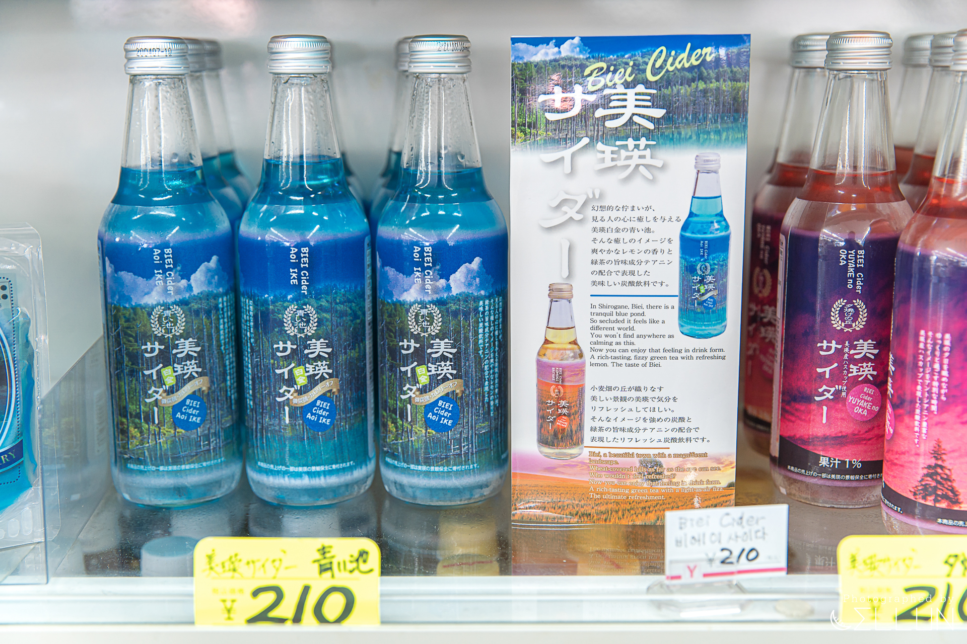 왼쪽 위부터 시계방향으로 비에이 청의 호수 사이다, 홋카이도 산 우유로 만든 요거트, 후라노 멜론맛 술, 삿포로 클래식 맥주입니다.