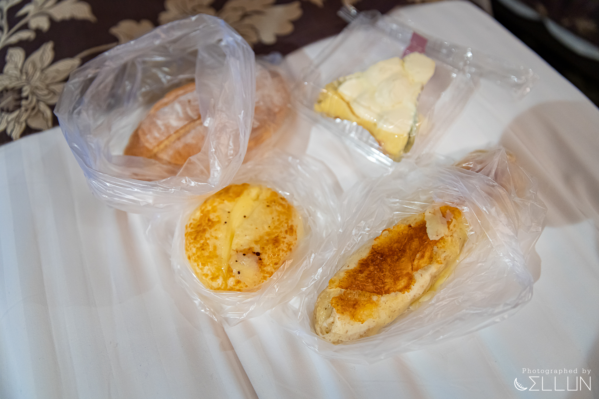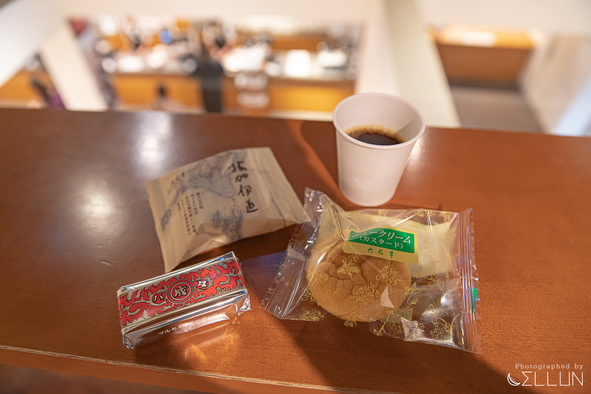 맨 왼쪽 길쭉한 크림 샌드된 팥 크림샌드(125엔), 오른쪽에 파이같이 생긴 것은 팥데니쉬롤(north kaido)(125), 그리고 비닐봉지에 담긴 둥근 빵은 커스터드슈(100엔)입니다. 커피를 무료로 제공해서 달디단 디저트랑 궁합이 잘 맞았고,