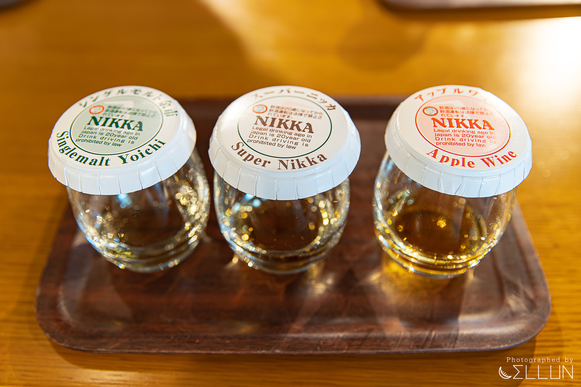 맨 왼쪽은 싱글몰트, 중간은 슈퍼 닛카로 각각 45도 43도 짜리 위스키이고, 오른쪽은 애플 와인으로 22도로 도수가 다소 낮고 달달한 과일 맛이 있는 술입니다.