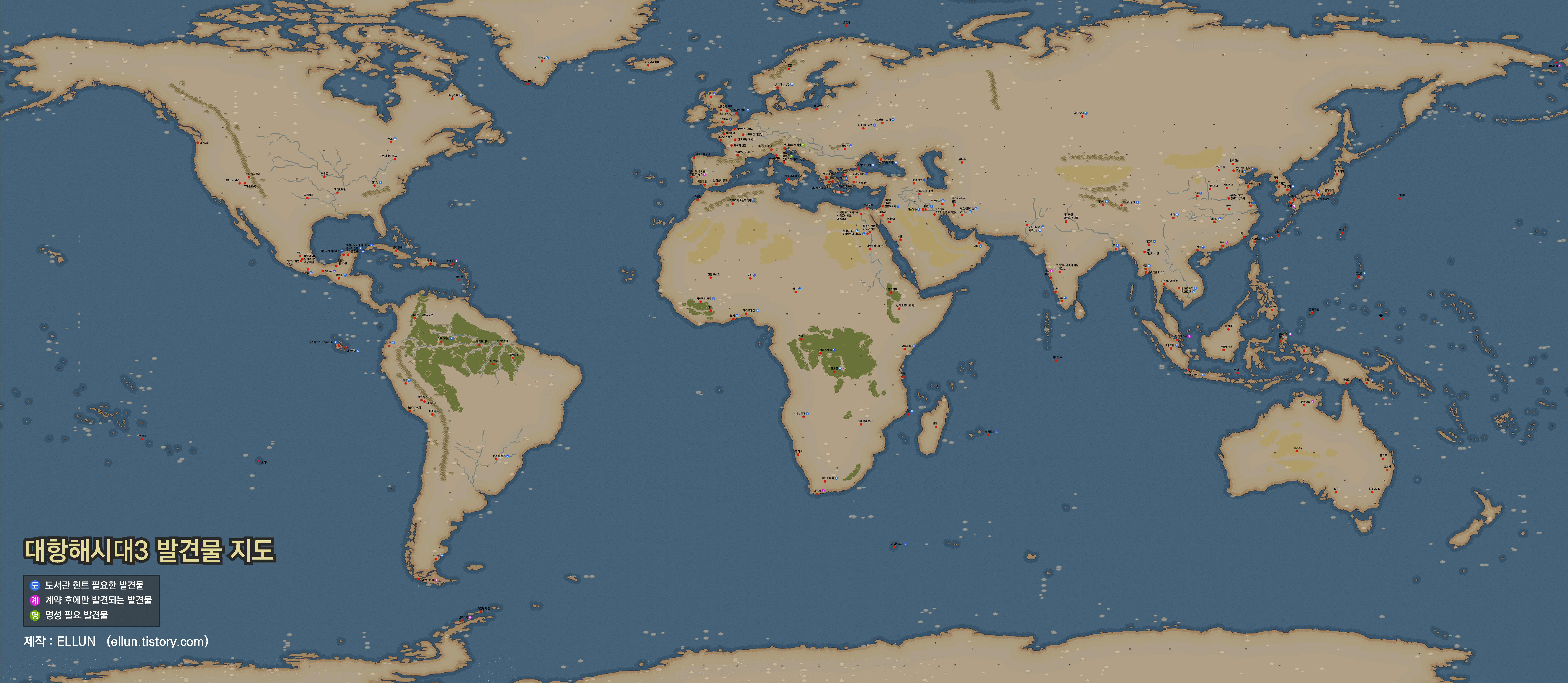 대항해시대3 발견물 위치를 지도 위에 표시한 그림을 공유합니다.