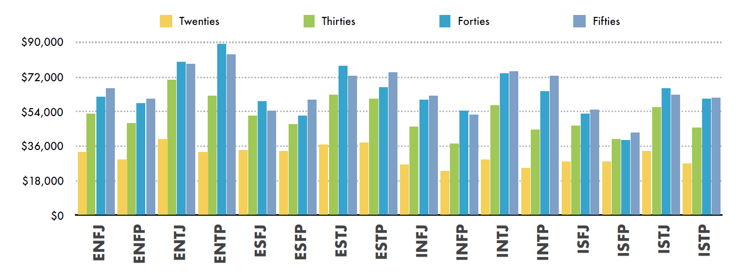 'The Income Effect of Personality Type' 보고서에서 또 다른 흥미로운 점은 연령대별로 세분화한 평균소득 통계입니다.